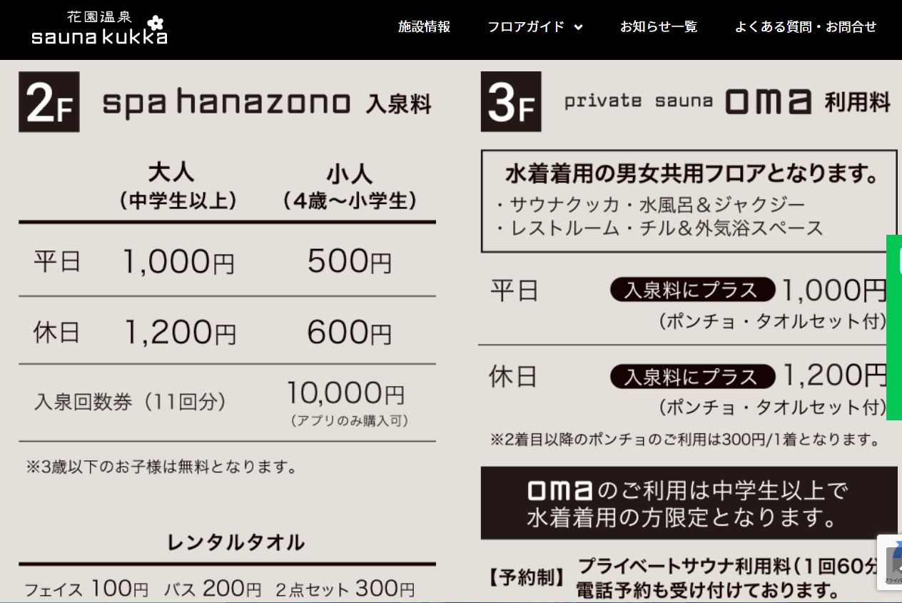 花園温泉sauna kukkaは、日帰り利用が中心ですが、時間制限のないフリー滞在スタイルのため、長時間の利用も可能です。料金は平日と休日で異なり、平日は大人1000円前後、休日は1200円前後が目安となっています。小学生以下の子どもは半額程度の設定で、家族連れにも利用しやすい価格帯です。