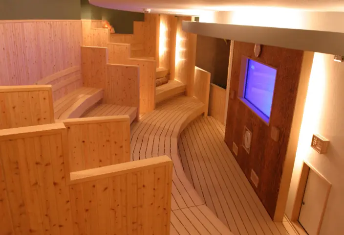 男性側のメインサウナは、いわゆるシアターサウナタイプです。壁面にテレビや映像が流れていて、座面も段差がしっかりあるので、好みの温度帯を探しつつじっくり汗をかけるスタイルになっています。